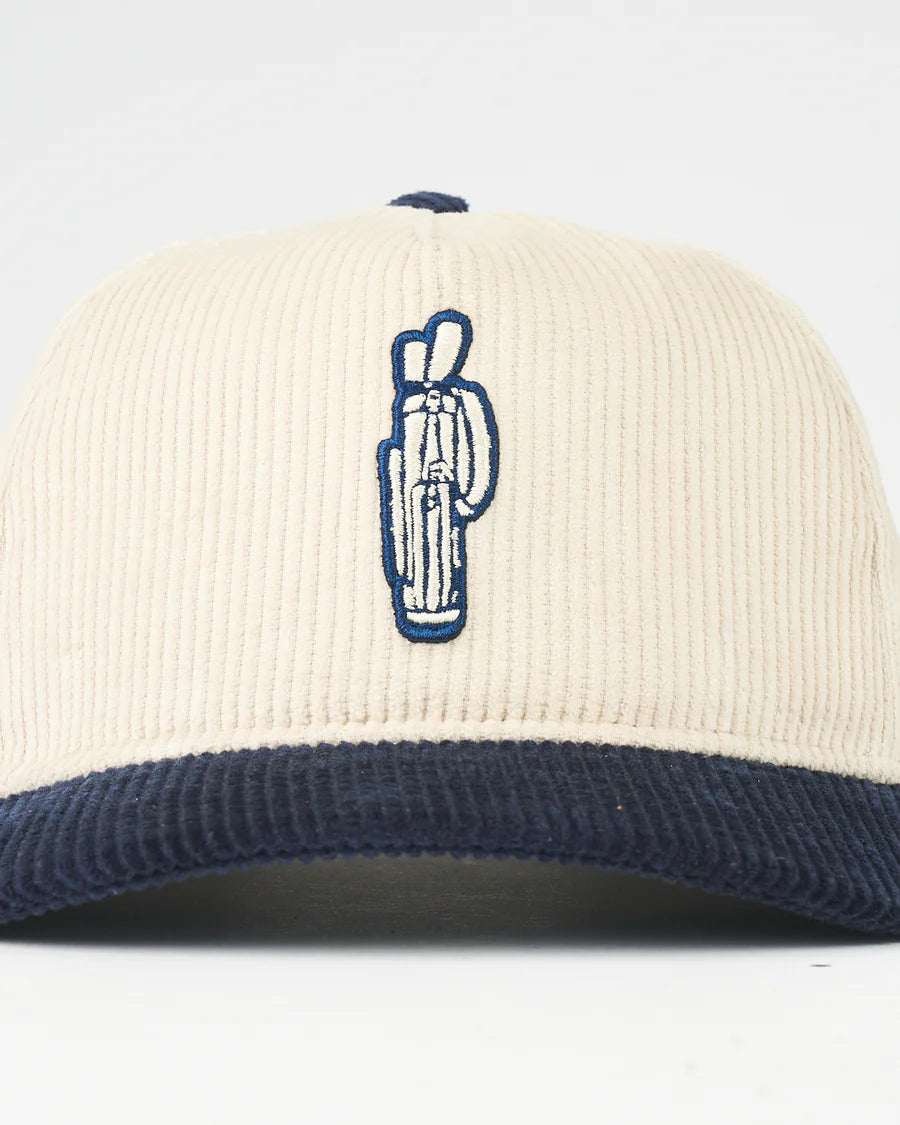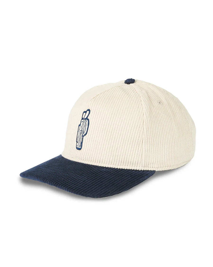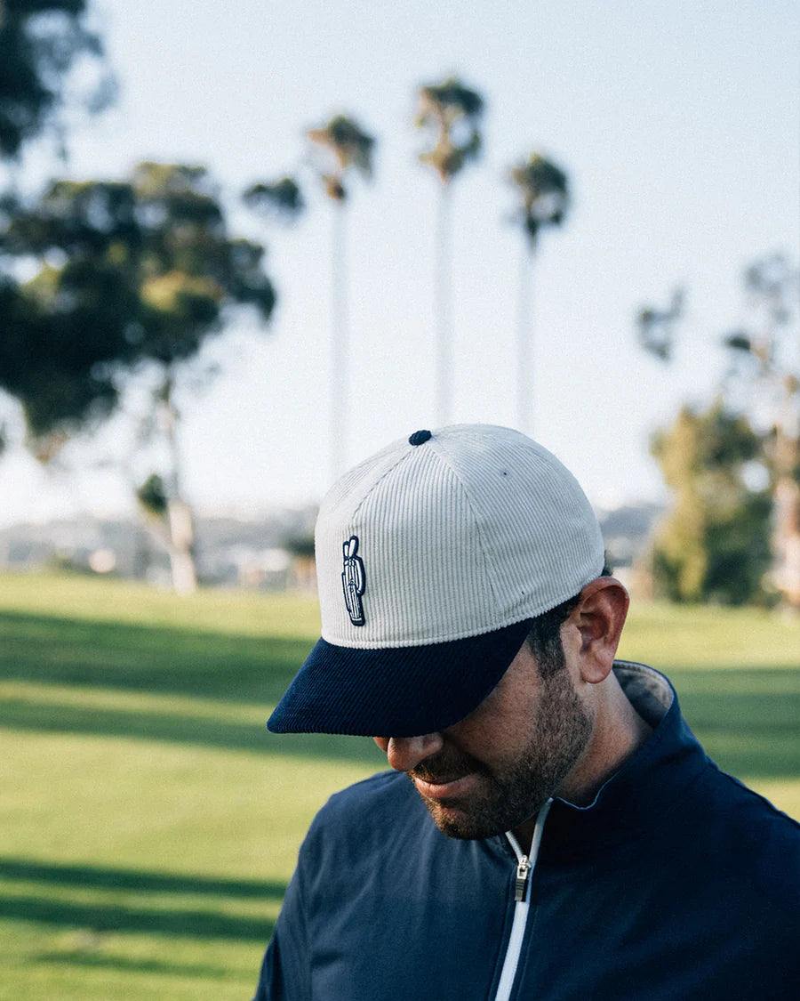 Discover the Carry On Strapback , a cap that combines the elegance of lifestyle with the classic design of golf. The luxurious corduroy gives a sophisticated feel, while the adjustable leather strap ensures a perfect fit. The embroidered patch with a classic golf bag on the front is a subtle tribute to the game and its tradition.