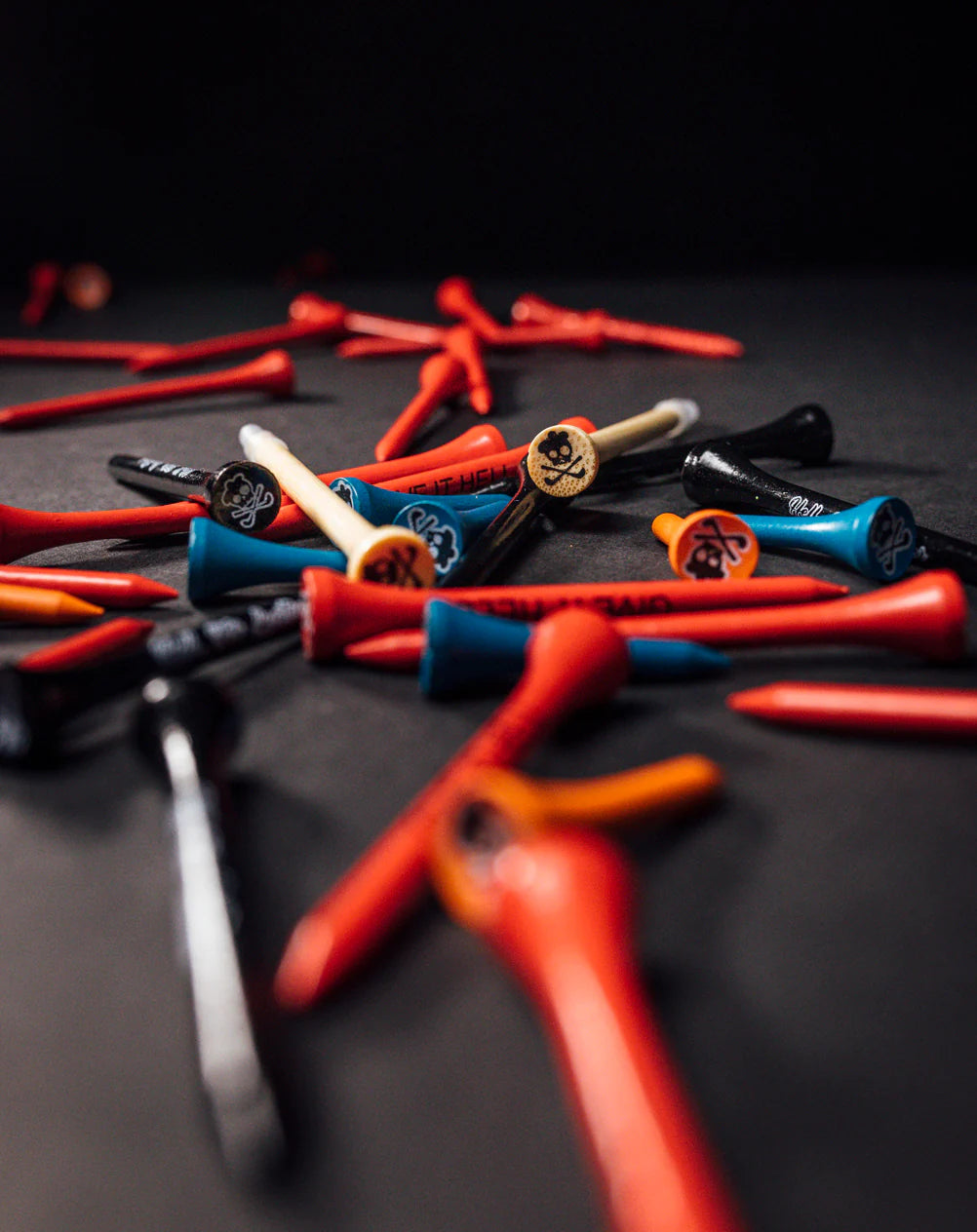 Våra stora röda och svarta tees är tillverkade av bambuträ, mäter 70 mm och har Skully-logotypen på koppen. Röda tees har texten "Give It Hell" tryckt längs sidan, medan de svarta tees har "Hell For Leather" tryckt.