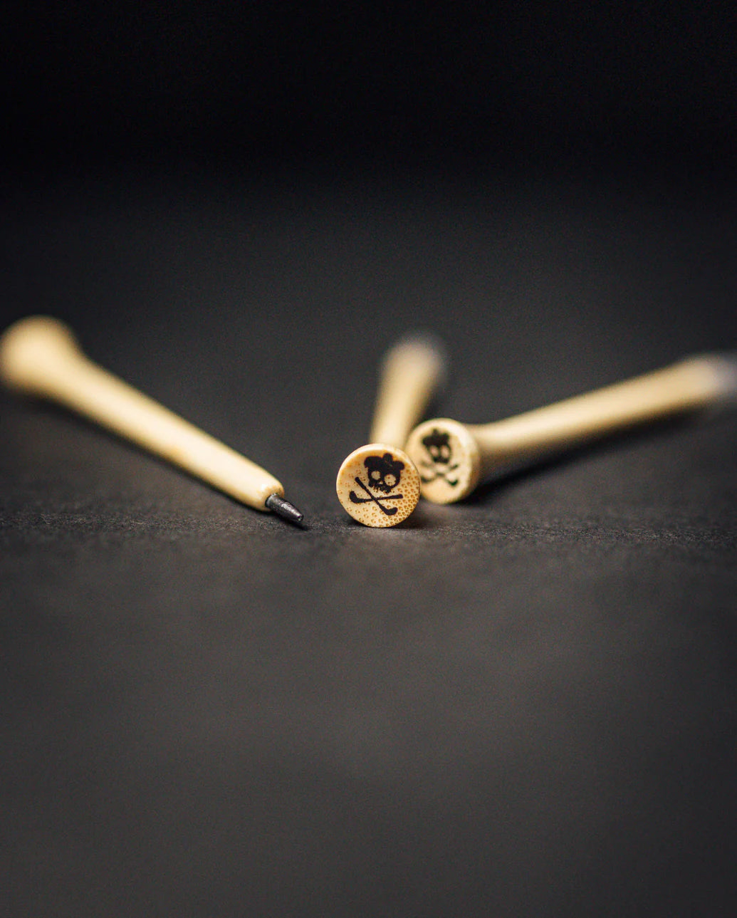 Våra små orange och teal tees, även de gjorda av bambuträ, mäter 35 mm och har Skully-logotypen på koppen.