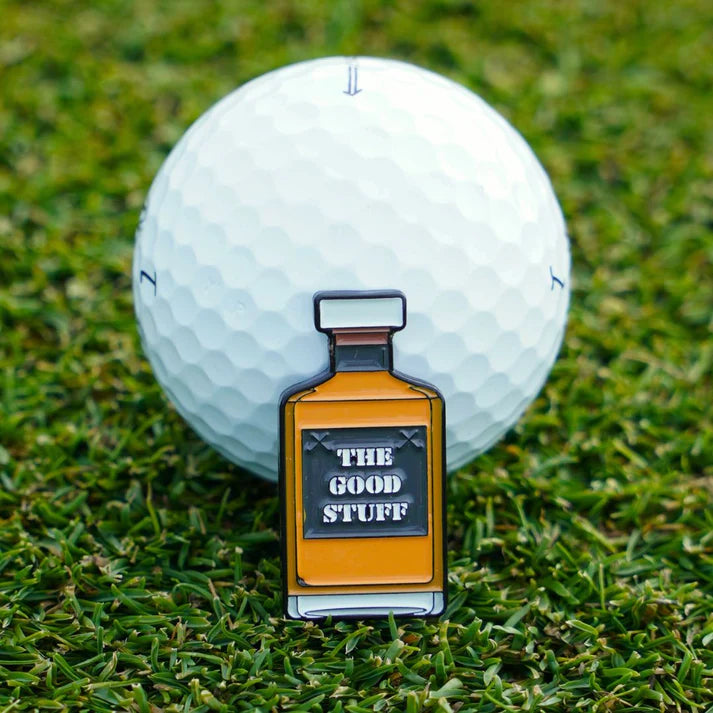 The Good Stuff: När nerverna smyger sig på inför ett viktigt putt, vet du att det är dags att lugna sig. Ta ett djupt andetag, fokusera, och sänk putten med självsäkerhet. Den här bollmarkören påminner dig om att du har det som krävs – bara ta en klunk och dränera den.